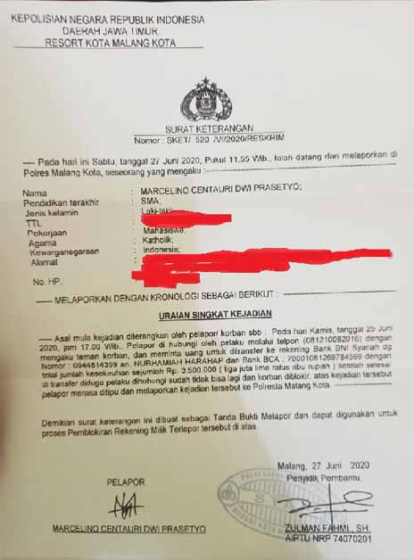 Setelah saya merasa tertipu, akhirnya saya melaporkan kejadian ini ke kepolisian dan mendapatkan surat kepolisian yang biasanya digunakan untuk bukti bahwa terjadi penipuan serta bisa disalurkan ke pihak bank untuk proses blokir rekening penipu dan refund (mendapatkan uang kembali dari penipu) meskipun tidak ada jaminan 100% uang kembali.