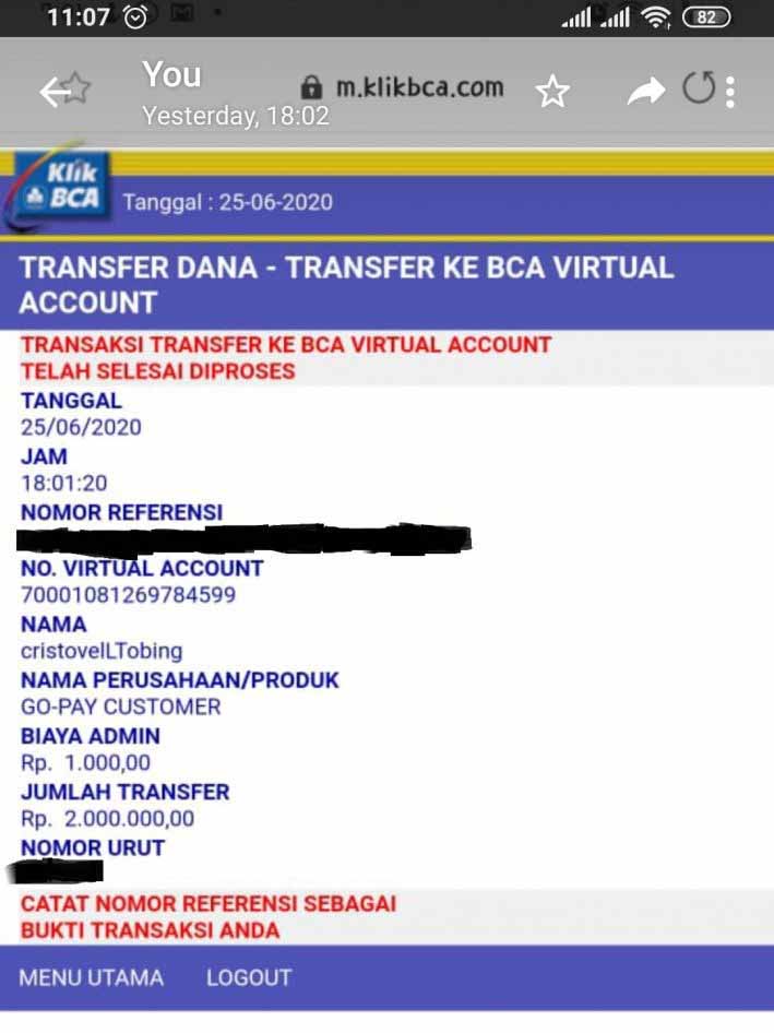 Penipu mengarahkan saya untuk mentransfer uang dengan alasan keluarganya yang sakit di Malaysia dan akan dikembalikan di kemudian hari uangnya. Karena saya kasihan (ayah beliau baru saja meninggal) dan berhubung saya juga percaya saja bahwa penipu adalah teman saya maka tetap saya transfer. Penipu mengarahkan untuk transfer melalui metode top-up GO-PAY dimana saat itu saya transfer dengan virtual rekening BCA.