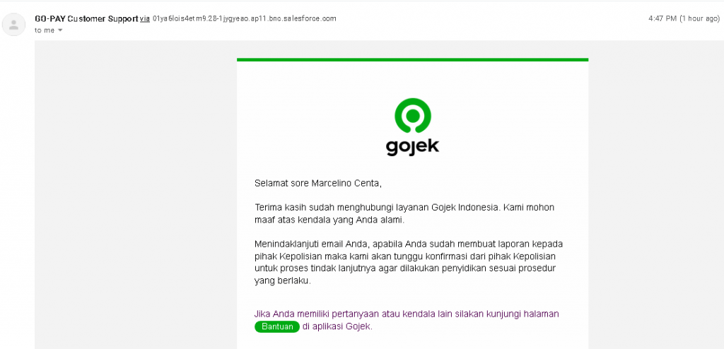 Pada saat itu langsung saja saya email ke pihak GO-JEK yang mengurusi perkara GO-PAY tersebut bersetakan bukti transaksi saya dan surat kepolisian. Sayang sekali balasan dari customer service sendiri adalah untuk menunggu konfirmasi dari pihak kepolisian yang melakukan penyelidikan, baru dari pihak go-jek akan melakukan penyelidikan sesuai prosedur mereka.